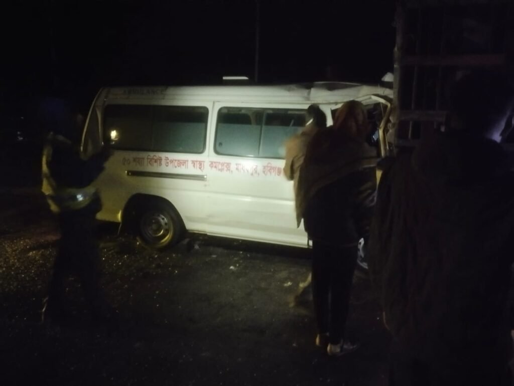পুলিশ ও স্থানীয় সূত্রে জানা যায়, ভোররাতে মহাসড়কে প্রচুর কুয়াশা থাকায় একটি পণ্যবাহী ট্রাক (ঢাকা মেট্রো-ট-১৮-৫৬৮৭) রাস্তার ওপর দাঁড়িয়ে ছিল। এ সময় মাধবপুরগামী অ্যাম্বুলেন্সটি (ঢাকা মেট্রো-ছ-৭১-১৯৫৭) কুয়াশার কারণে ট্রাকটিকে দেখতে না পেয়ে পেছন থেকে সজোরে ধাক্কা দেয়। সংঘর্ষে অ্যাম্বুলেন্সের সামনের অংশ দুমড়েমুচড়ে যায়।